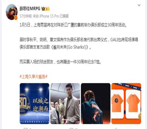 薛思佳报道:“1月5日,上海男篮将在对阵浙江广厦的赛前,举办俱乐部成立30周年活动。届时李秋平、姚明、章文琪将作为俱乐部名宿代表出席仪式,GALI也将现场演唱俱乐部首支官方战歌《鲨向未来(Go Sharks!)》。”